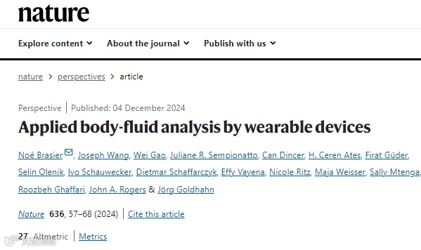 2024年12月4日,瑞士苏黎世联邦理工学院Noé Brasier、加州大学圣地亚哥分校Joseph Wang、加州理工学院高伟、西北大学John A. Rogers等在Nature期刊上发表了题为“Applied body-fluid analysis by wearable devices”的最新论文。Noé Brasier为文章第一作者及通讯作者。在这篇观点文章中,回顾了最先进的可穿戴体液分析设备及其向临床应用的转化,并深入探讨了它们的临床目的。