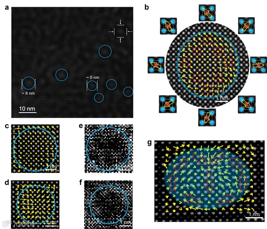 图3.极性斯格明子纳米畴的STEM表征。(a) Pb(Ti0.75Sn0.25)O3样品的STEM暗场像测试图像,其中存在的纳米畴用蓝色圆圈标出。(b) 纳米畴的HAADF-STEM图像与其中心发散型斯格明子极化矢量分布图,插图为红色圆圈标出的晶格中的B位原子(红色表示)相对与A位原子(蓝色表示)发生的位移,方向用黄色箭头标出。(c-f) 中心发散型(c)与中心汇聚型(d)斯格明子极化织构与其对应的4D-STEM环形暗场像图像(e)和(f)。(g) HAADF-STEM图像与其极化矢量分布图,显示出两侧极化连续旋转并汇入中心形成共线极化的极化织构,与极性斯格明子纳米畴侧面相对应。