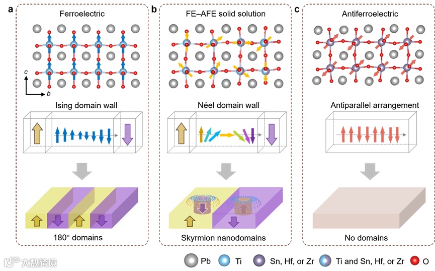 图1.极性斯格明子纳米畴的形成。示意图分别展示了(a) 铁电体PbTiO3,(b) 铁电-反铁电固溶体,(c) 反铁电体PbSnO3,PbHfO3,PbZrO3的晶格中偶极子(上),畴壁处偶极子排列方式(中)以及对应电畴结构(下)。