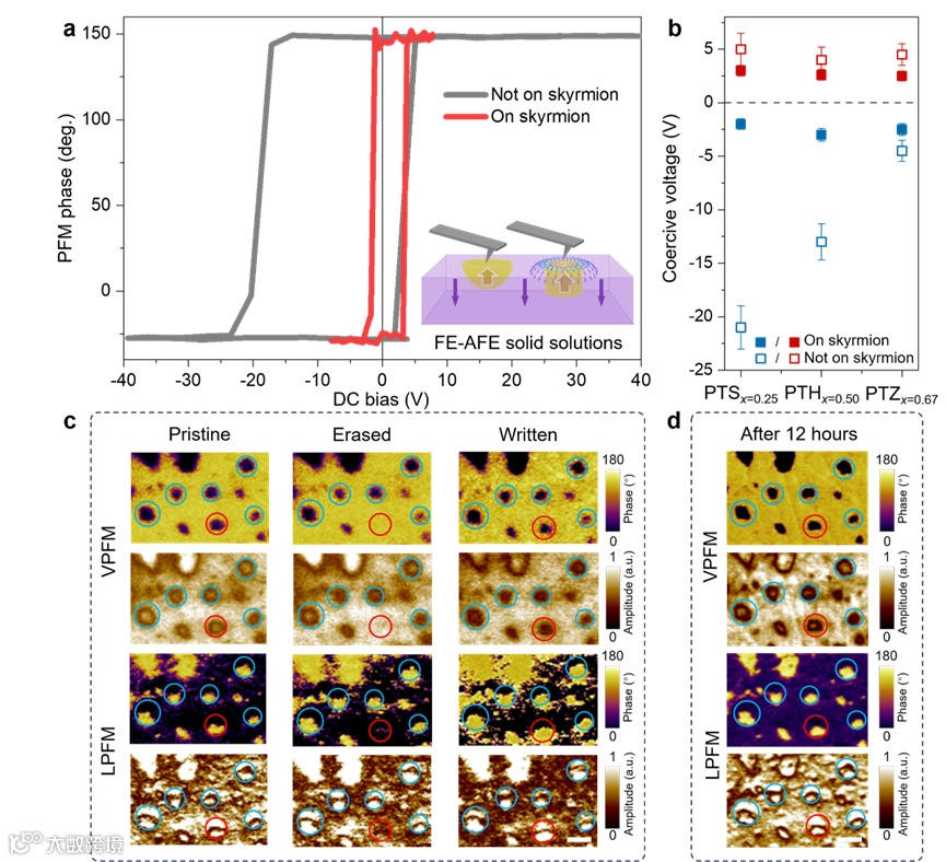 图6. 极性斯格明子纳米畴的翻转特性。(a) Pb(Ti0.75Sn0.25)O3固溶体中极性斯格明子纳米畴与无极化织构普通畴的PFM相位回线,插图为测量过程与极化翻转示意图。(b) Pb(Ti0.75Sn0.25)O3、Pb(Ti0.50Hf0.50)O3和Pb(Ti0.33Zr0.67)O3固溶体的矫顽电压。(c) VPFM和LPFM图像显示极性斯格明子纳米畴的翻转过程。(d) VPFM和LPFM图像显示写入的极性斯格明子在12小时后的保持状况。