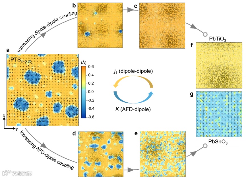 方向的面外极化分量。(b-c) 偶极-偶极相互作用强度j1逐渐增强时电畴结构演化,其中(b) j1 = -0.97 eV/Å2,(c)j1 = -1.02 eV/Å2。(d-e) 反铁电畸变-偶极相互作用强度K逐渐增强时电畴结构演化 ,其中(d) K = -0.01 eV/(Å×rad),(e) K = -0.50 eV/(Å×rad)。(f) 模拟的PbTiO3电畴结构。(g) 模拟的PbSnO3电畴结构。有效哈密顿量的参数拟合及模拟采用ALFE-H软件包(obeyond.nju.edu.cn/Code/index.html)实现。