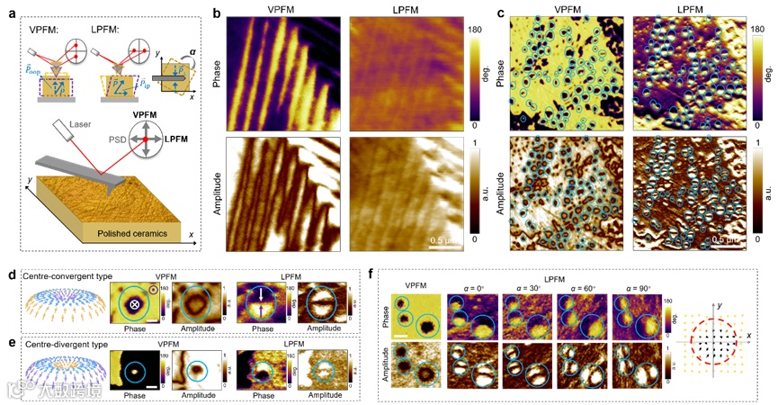 图2.极性斯格明子纳米畴的Vector PFM表征。(a) 陶瓷样品Vector PFM测试示意图。(b),(c) VPFM相位图、VPFM振幅图、LPFM相位图和LPFM振幅图,其中(b)为PbTiO3样品,(c)为Pb(Ti0.75Sn0.25)O3样品,极性斯格明子纳米畴用蓝色圆圈标出。(d) 中心汇聚型斯格明子极化织构示意图与其Vector PFM图像。(e) 中心发散型斯格明子极化织构示意图与其Vector PFM图像。(f) 样品测试角度分别为0°,30°,60°,90°时的Vector PFM测试结果与纳米畴面内极化矢量分布图,图中标尺为100 nm。