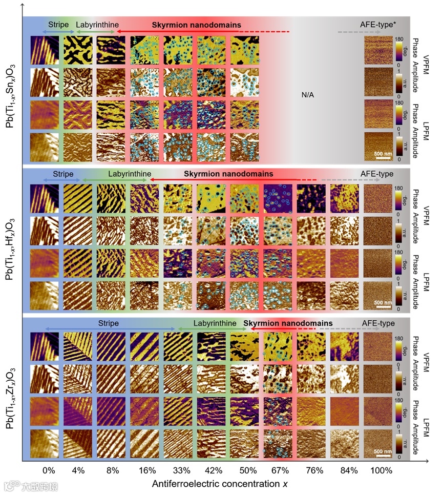 图5. 极性斯格明子纳米畴成分相图。随着反铁电浓度x从0%(PbTiO3)增加到100%(PbSnO3、PbHfO3或PbZrO3)时固溶体中电畴结构的演变过程。中间区域展示了在PbTi1-xSnxO3、PbTi1-xHfxO3和PbTi1-xZrxO3固溶体中形成极性斯格明子纳米畴的成分区域。