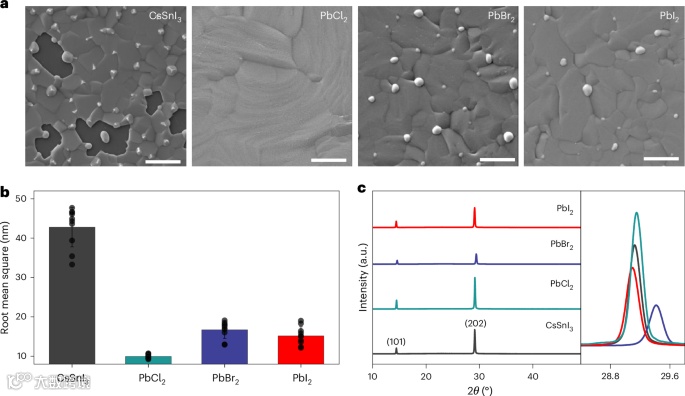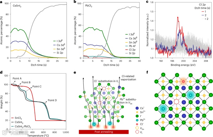 为了解决这些问题,韩国浦项科技大学Yong-Young Noh教授、电子科技大学朱慧慧教授、刘奥教授等研究人员合作在Nature Electronics期刊上发表了题为「Vapour-deposited high-performance tin perovskite transistors」的最新论文。研究人员采用热蒸发方法,首次在无机CsSnI3体系中引入PbCl2作为固态反应引发剂,有效引导了薄膜中各组分的反应过程,成功制备出高质量、致密均匀的钙钛矿薄膜。该方法不仅调控了CsSnI3通道层过高的空穴浓度,同时也显著提升了器件性能。