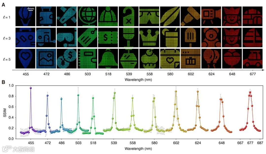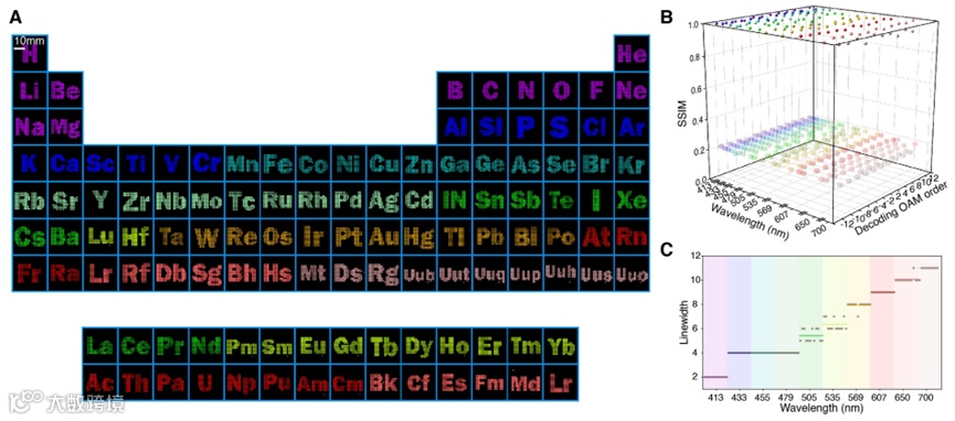 基于上述提到的设计方法,研究团队将纯相位全息图映射到宽带几何相位型超表面,通过优化氮化硅纳米柱的尺寸,该方法成功实现了基于12个波长(455 nm至677 nm)和3个OAM态(l = -1, -3, -5)的36信道图像重构(图3A)。结果表明,在正确波长和OAM条件下,重建图像的平均SSIM值达到0.82,创下当前最高水平,同时图像平均线宽最低可达3.7 nm(图3B)。