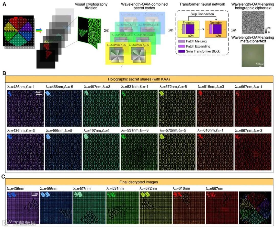 研究团队结合色散工程与人工智能优化,在动量空间巧妙构建稀疏 k-波矢滤波孔阵列(KAA),并引入 Transformer 神经网络优化纯相位全息图,实现了不同信息通道的图像精准匹配 KAA 采样点阵。实验首次在单一全息片上成功重建 118 个独立彩色图像通道,突破性地将波长选择性线宽压缩至 2 nm,刷新了彩色全息术的线宽极限。进一步地,研究团队利用波长与轨道角动量(OAM)作为密钥,实现了高安全性的彩色全息视觉加密方案,成功将信息率提升至传统方法的约2500 倍,建立了前所未有的光学信息安全防线,为下一代高安全性视觉加密、三维显示、光学人工智能及激光雷达领域带来了革命性进展。