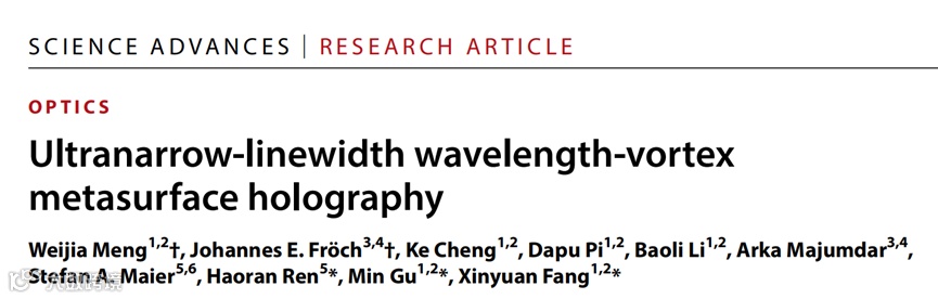 相关成果近日发表在国际顶尖学术期刊《Science Advances》,题目为“Ultranarrow-linewidth wavelength-vortex metasurface holography”。 论文通讯作者为上海理工大学顾敏院士、方心远研究员以及澳大利亚莫纳什大学任浩然研究员。论文第一作者是上海理工大学智能科技学院孟维佳同学与美国华盛顿大学Johannes E. Fröch博士。澳大利亚莫纳什大学Stefan A. Maier教授及美国华盛顿大学Arka Majumdar教授对论文提出重要建议。