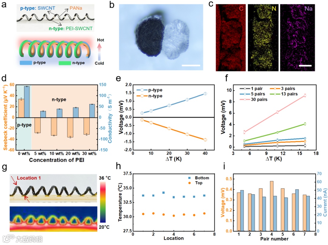 本研究采用聚乙烯亚胺(PEI)溶液作为n型掺杂剂对Janus螺旋水凝胶纤维进行n型改性处理。为优化纤维的热电性能,系统研究了不同PEI浓度对n型热电纤维性能,并通过对比分析确定了具有最佳热电性能的PEI掺杂浓度。可以看出,改性成功的p/n热电螺旋纤维的开路电压随着p/n对数的增加而增大,并且具有良好的均匀性和连续性。