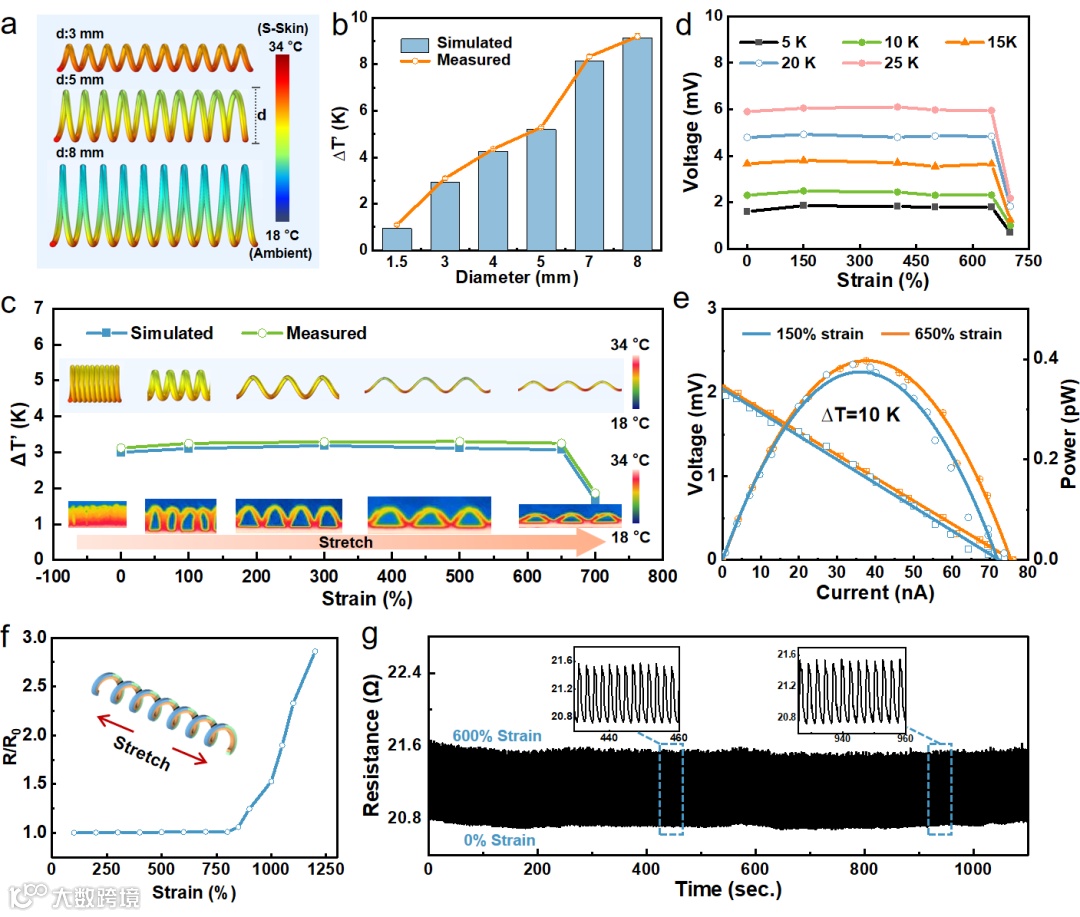 维持螺旋纤维内置温度梯度(ΔT’)的稳定性是实现应变不敏感热电性能的关键。基于COMSOL Multiphysics的有限元模拟与实验测试数据共同证实,即使在650%的超高应变范围内,螺旋纤维仍能保持ΔT’的稳定。当线圈轴向间距进一步缩小时,ΔT’会相应地下降。循环力学测试显示,在600%应变下经历500次连续加载-卸载循环后,器件的电阻波动幅度始终低于4%,展现出优异的机电稳定性。