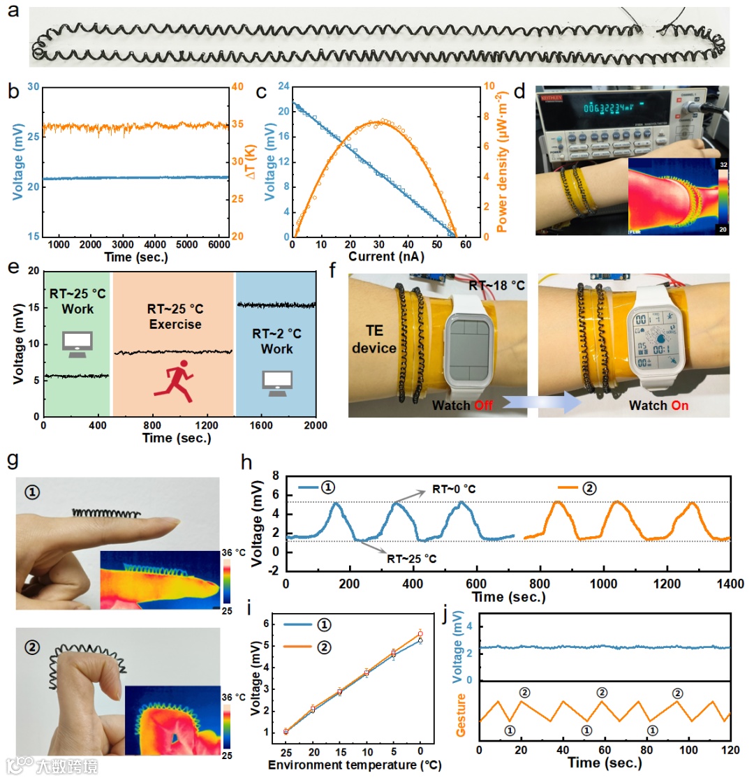 本研究开发了一种基于热电Janus螺旋纤维的可穿戴能量收集装置。该装置由90对串联的p/n热电单元构成,具有优异的曲面顺应性和机械柔韧性。实验结果表明,当该器件集成于人体手臂时,能够有效收集并转换人体热能。值得注意的是,该热电纤维在不同环境条件和运动状态下均表现出稳定的能量收集性能。此外,该器件还展现出优异的应变不敏感特性,其温度传感灵敏度达到 -176 μV/℃,且输出电压信号不受手指弯曲等机械形变的干扰。这种独特的设计为可穿戴热电设备的开发提供了新的思路,在人体能量收集和温度监测领域具有广阔的应用前景。