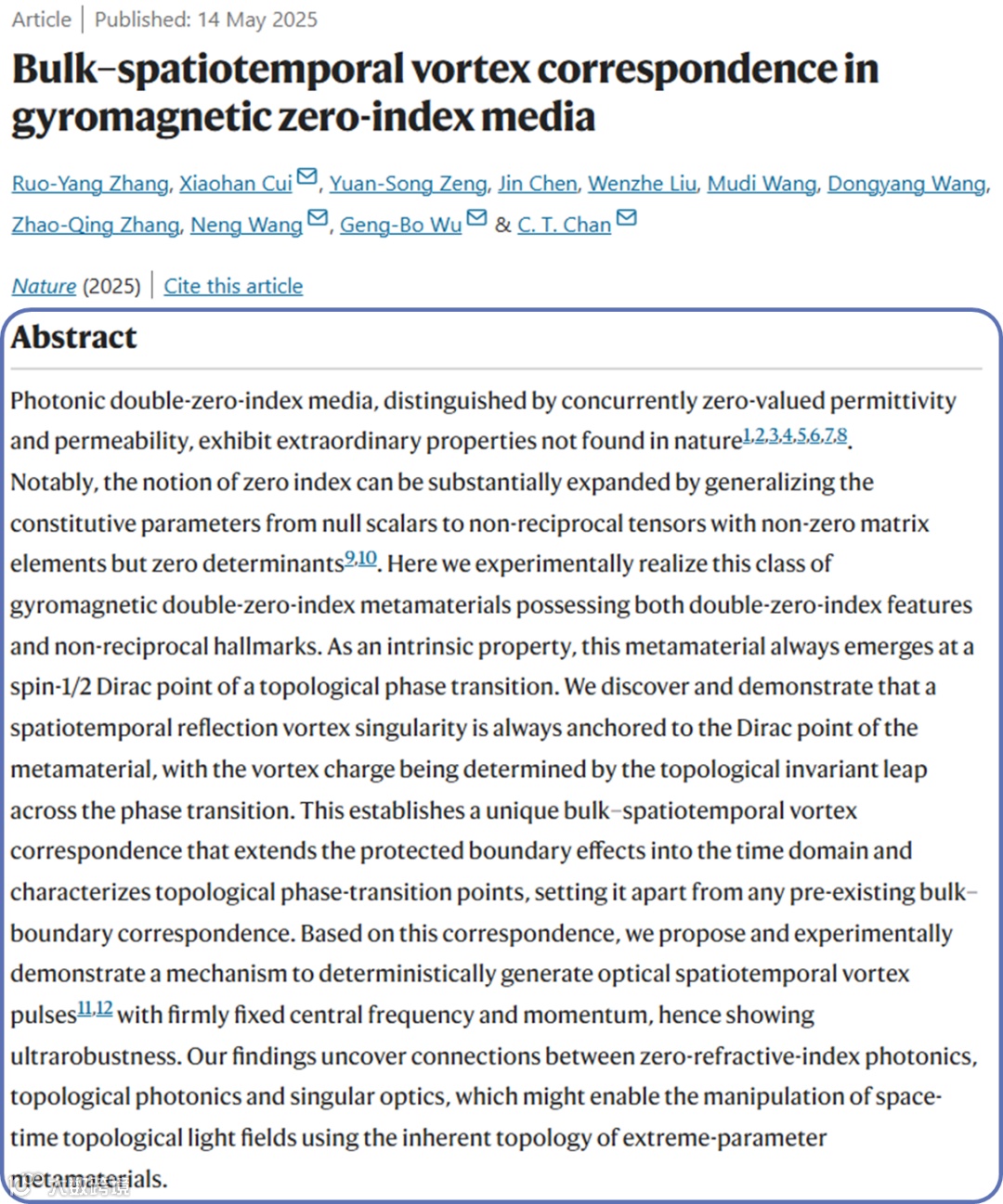 研究成果以题为 “Bulk–spatiotemporal vortex correspondence in gyromagnetic zero-index media” 发表于《Nature》上。香港科技大学Ruo-Yang Zhang、Xiaohan Cui、香港城市大学Yuan-Song Zeng为论文共同第一作者,香港科技大学Xiaohan Cui、C. T. Chan、深圳大学Neng Wang及香港城市大学Geng-Bo Wu为论文共同通讯作者。