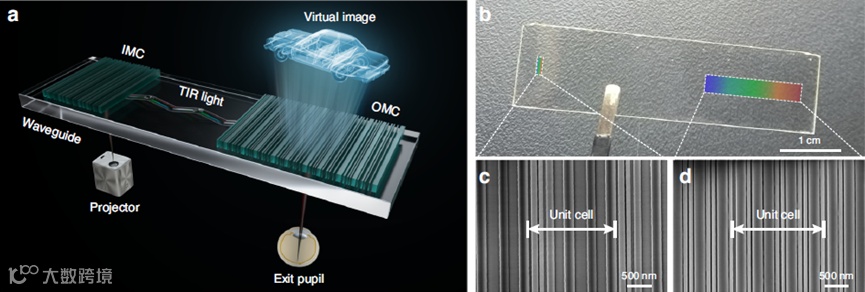 增强现实因其彻底改变我们感知和与数字世界互动的方式的潜力而不断受到关注。它为各种前沿领域带来了新的机遇,例如元宇宙、智能工业、智能医疗、智能旅游等。AR 技术不断向超紧凑外形和轻量化设计发展,增强了用户体验。衍射波导组合器因其类似眼镜的外观、最小的重量、高吞吐量和大规模生产能力而成为商用 AR 设备的首选。波导解决方案采用集成了衍射输入和输出耦合器的超薄平面玻璃。载有图像的光线通过输入耦合器进入波导,通过全内反射传播,并由输出耦合器提取到用户的眼睛。在此显示过程中,这些耦合器是决定成像质量的关键组件。在开发基于超表面的波导 AR 显示器方面,先驱者们已经在扩大角带宽、提高效率、扩大视场和波长复用方面取得了显著进展。关于波导 AR 显示器中的色差校正,虽然色散补偿波导提供了一种解决方案,但它导致视场有限且出射光瞳固定较小。值得一提的是,迄今为止开发的大多数消色差超表面耦合器都依赖于复杂的多层纳米结构来增强设计灵活性并实现所需的色散控制。然而,这种方法带来了具有挑战性的制造过程。此外,耦合器固有的强烈角度扩展不可避免地会导致色彩和角度均匀性的下降。