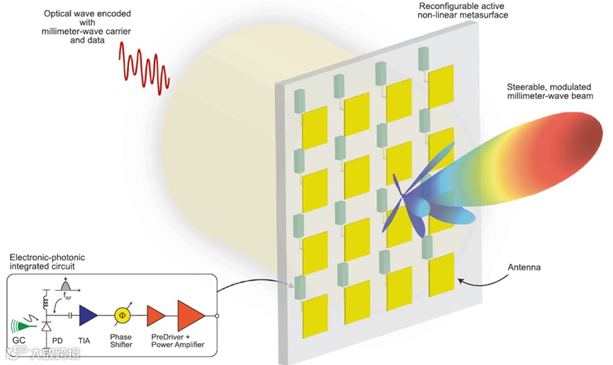 近日,宾夕法尼亚大学的Firooz Aflatouni教授团队展示了一种非线性有源电子光子超表面,它将信息从入射光波传输到毫米波束。概念验证超表面被设计为在用 193 THz 的光波照射时辐射可操纵的 28 GHz 光束,并由光学同步电子光子芯片组成,这些芯片平铺在包含微带贴片天线阵列的印刷电路板上。用数据编码的毫米波载波调制的光通过微透镜耦合到电子光子芯片中。在每个芯片内,毫米波信号被检测、相位调整、放大并路由到片外天线。研究人员演示了在 60° 仰角和方位角范围内的光束控制以及通过光纤无线链路以 2 Gb/s 的速度传输数据。该工作所提出的非线性可重构有源超表面由光学同步的电子光子元件组成,有利于数据传输和毫米波光束整形,同时与高度可扩展的架构兼容,并有可能为下一代通信、计算、传感和量子系统实现节能、紧凑且复杂度降低的链路。相关工作发表在《Nature Communications》上。(刘帅)