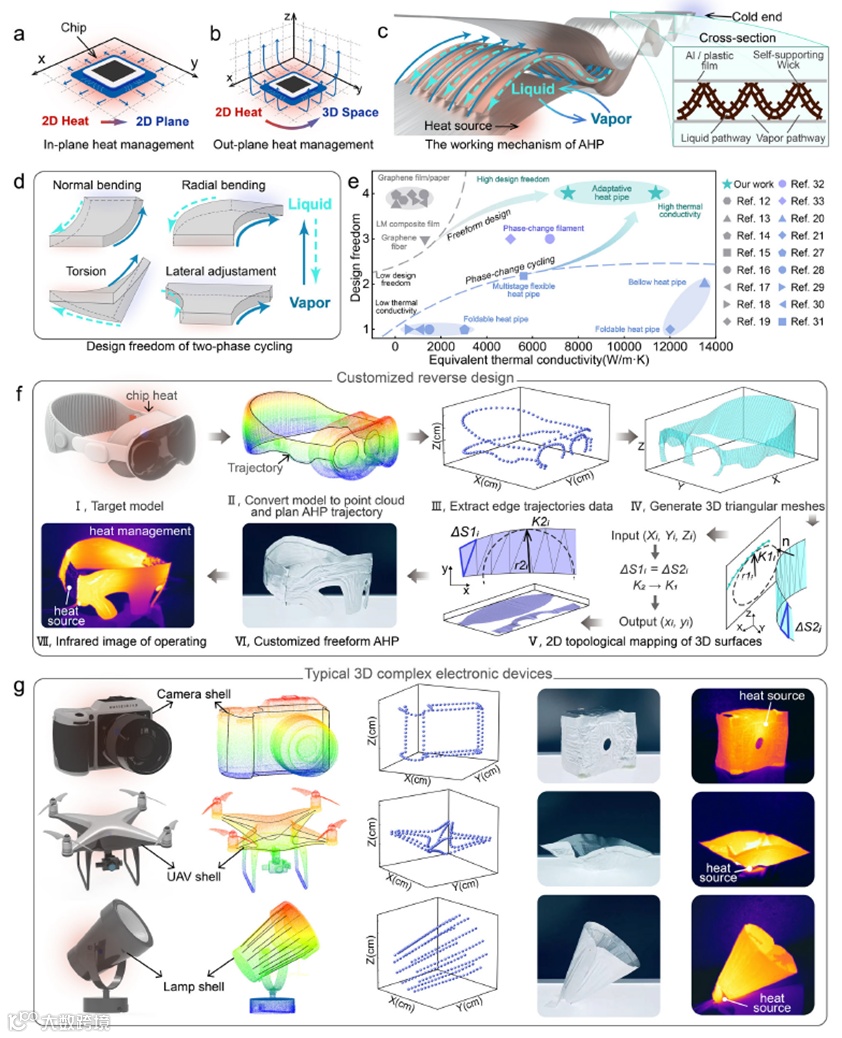 近日,厦门大学周伟教授和凌伟淞助理教授等人,提出了一种自适应三维两相热循环系统(Adaptative Heat Pipe,AHP),突破了传统散热器形态的限制,为复杂结构电子设备提供了一种高效的热管理方案。该研究团队利用逆向工程技术与数据驱动的三维热键合工艺,设计并制造了一种能够自由弯曲、扭转、适应各种形状的热管,从而在电子设备的有限空间内,实现高效的两相换热循环。实验结果显示,该系统的最大热导率高达 11,363 W/m·K,远超传统单相导热材料,如石墨烯薄膜和柔性散热膜。AHP 能够在三维空间内灵活传输热量,不仅可用于传统电子设备,还适用于形态复杂的 AR/VR 设备、摄像头、无人机等新兴电子产品,实现高效散热。研究人员利用数字光处理(DLP)3D 打印技术制备复杂形状的 AHP 结构,该系统由铝塑膜外壳和三维铜网芯体组成。铝塑膜外壳通过热键合技术进行封装,形成封闭的两相换热系统,而铜网芯体则提供毛细作用,使冷凝液能够回流至蒸发区域,保持稳定的相变循环。实验表明,与传统平面热管相比,AHP 在三维复杂形状设备中的散热效率提升了 44.4%,有效降低了设备热负荷,提高了热管理系统的可靠性。该研究的突破性在于,AHP 不仅是一种散热组件,还可作为设备的结构支撑部分,甚至可以集成到设备外壳中。在 VR 头显的应用测试中,AHP 作为头戴结构的一部分,成功将芯片温度从 100°C 降至47.8°C,相比传统热管和石墨烯薄膜散热方案,分别降低了 48.6% 和38.6%。此外,AHP 还能应用于无人机、相机等对散热要求较高但结构复杂的电子设备,为下一代高效热管理系统提供了一种集成式、智能化的解决方案。研究成果发表在《Nature Communications》上(张琰炯)。