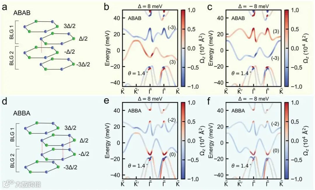 近年来,凝聚态物理领域对电子能带拓扑特性的研究不断深入,其中莫尔材料因其独特的平坦能带结构和电可调性成为重要研究对象。这类材料通过层间扭转形成超晶格结构,可在打破时间反演或反演对称性时产生贝里曲率热点。理论研究表明,不同的堆叠顺序会显著改变平坦能带中贝里曲率的分布,进而影响其拓扑特性。然而,实验上关于堆叠顺序对量子几何量的调控作用仍缺乏系统性探索。以1.4°扭转双层石墨烯(TDBG)为例,其两种堆叠构型(AB-AB与AB-BA)可形成反演对称性破缺的莫尔超晶格,但现有研究尚未明确揭示堆叠顺序如何通过量子几何量(如贝里曲率偶极子,BCD)影响宏观输运行为。这一问题的解决对理解拓扑关联相的形成机制及开发新型量子器件具有重要意义。