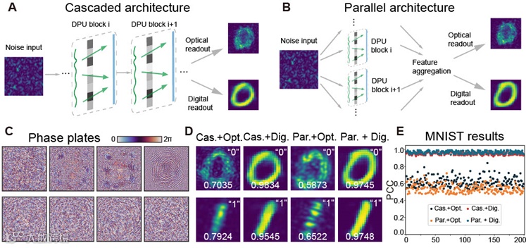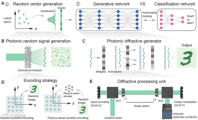 生成式神经网络(Generative Models)近年来成为机器学习和人工智能领域的热点技术,在图像生成、文本生成等科学与艺术领域具有广泛应用,同时重新定义了机器智能的边界。这类模型通过学习数据的统计分布,从中采样随机噪声生成新的信息。然而,目前大多数生成式神经网络依赖数字计算硬件实现,受限于计算效率和能耗问题。光计算作为一种新兴的计算范式,研究光与物质相互作用现象在信息处理领域的可能性。其中,光学神经网络利用光的高并行、低延迟和低能耗特性,成为光计算领域的重要方向,催生了许多创新性的光学神经网络架构。然而,现有研究多集中于分类任务的确定性神经网络模型,对生成式模型的探索相对有限。