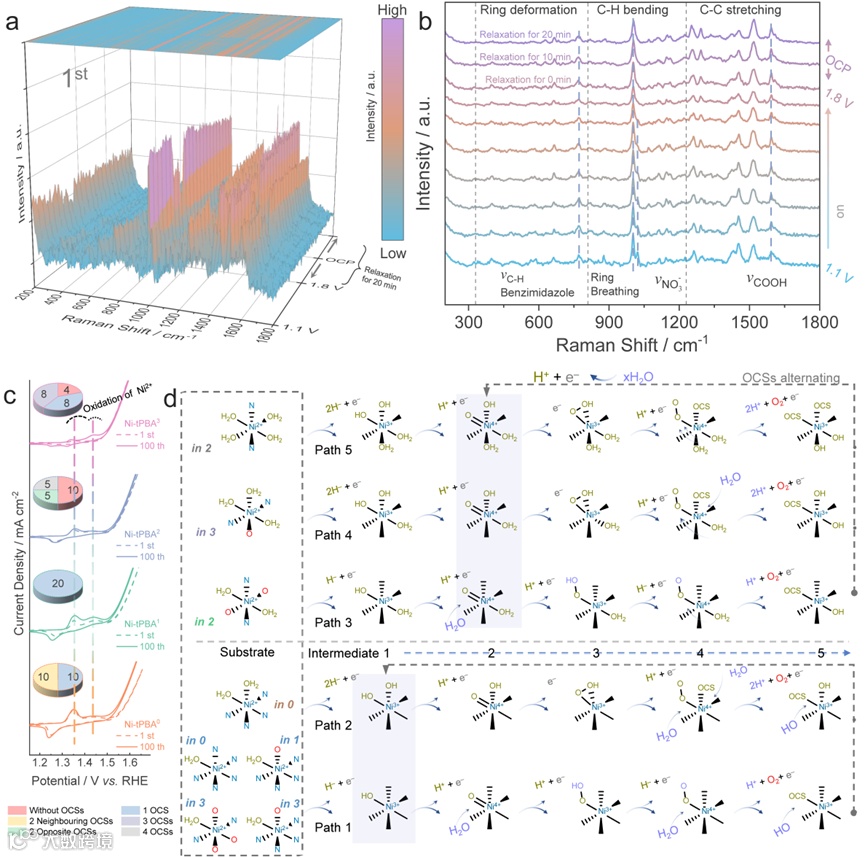 电解水技术是支撑高能量氢能源储能产业的重要途径,其中开发廉价高效的析氧反应(OER)催化剂是提高装置能量转换效率的关键。本研究通过配体设计和阴离子调控,构建了具有不同配位水环境的配合物催化剂Ni-tPBA3,并发现了配位水分子的数量和位置可极大地影响OER过程。研究结果显示,催化剂中与单个水分子配位的金属中心倾向于发生分子间氧耦合路径;而与两个相邻水分子配位的金属中心更易发生低热力学能垒的分子内氧耦合过程;引入更多的配位水分子时,金属中心可能倾向于一种动态的分子内氧耦合机制,从而减少OER动力学步骤。作为概念验证,具有多配位水分子镍中心的催化剂Ni-tPBA0~3展现出最优的电催化OER性能,其在10 mA cm–2下具有248 mV的低过电位,且在10~400 mA cm–2的动态电流密度下可稳定工作超过200小时。本研究系统阐释了配位水分子在电催化水氧化过程中的潜在作用和机理,为开发先进的配合物催化剂提供了新的设计理念。