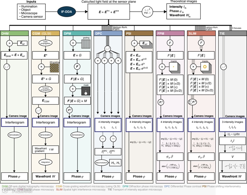 图4. 用IF-DDA计算定量相显微镜图。这张图显示了数值过程,从显微镜样品平面的光场计算,以及使用8种不同的QPM显微镜模型对其进行处理,到类似实验的强度、相位和波前图像的计算。