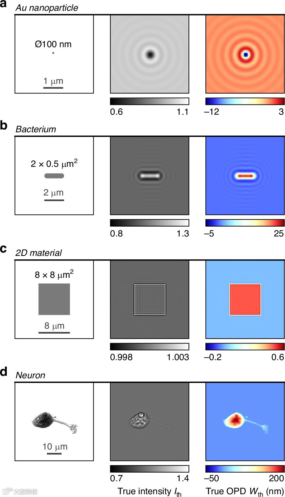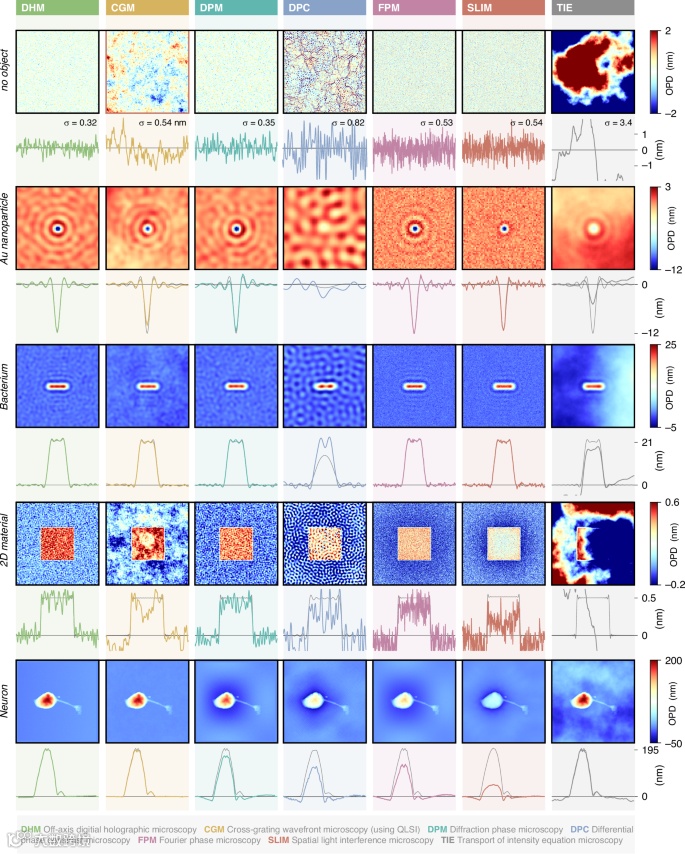 团队描述了与8种QPM技术(CGM, DHM, DPM, DPC, PSI, FPM, SLIM和TIE)相关的模拟结果,对4个不同的物体成像,分别是金纳米颗粒,细菌,二维(2D)材料和神经元(图5)。选择这些对象是因为它们是较为常见的研究系统,并且覆盖了不同的对象尺寸。这里的目的是研究所有QPM的准确度。准确度通常被定义为正确度和精确度的结合。正确度是指建模图像与真实图像的任何系统偏差,即伪影,而精度是指由图像上的噪声引起的不准确性测量。图6采集了7种显微镜技术对4个目标物体的OPD图像的数值模拟,并与真实的OPD图像(灰线标记为“理论”)进行了比较。在这些模拟图像中,没有添加散粒噪声,以便于比较可能存在的伪影。图7绘制了类似的数据,其中散粒噪声已添加到原始相机图像中。这组图像是为了研究测量的精度,即信噪比。5个被研究的系统是(i)一个空白区域,以更好地量化噪声水平,(ii)一个100纳米金纳米颗粒,(iii)一个细菌,(iv)一个2D材料,(v)一个神经元。图6和7所示的结果突出了不同技术之间不同程度的噪声和与真实值的偏差情况。为了量化这些模拟的QPM的准确性程度,团队从所有模拟图像中测量了生物物理量(细菌和神经元的干质量值),NP的复杂光学偏振性和2D材料的平均OPD。通过对细胞图像进行分割后的像素求和来评估细胞的干质量值,同时测量NP的光学偏振性,如图8。由于纳米粒子是最小的物体,因此测量中存在着最大的不准确性(图8(a))。即使在无噪声图像中,测量结果也因技术不同而变化,这是因为存在衍射环,使得图像分割更加困难,带来测量误差。无论采用哪种技术,纳米粒子都没有明显的伪影(如图6所示)。同样,无论使用的是哪种QPM,对细菌的测量也不会受到伪影的影响(如图8(b)所示)。相比之下,SLIM技术表现出现轻微的测量偏差。使用DPC、FPM和SLIM技术对于大型物体(如石墨烯(图8(c))和真核细胞(图8(d)))的测量结果通常是不准确的。图7中观察到的噪声的存在使得生物物理量的测量值更加分散的分布在真实值周围。为了量化这种离散分布趋势,团队进行了12个相同的模拟,对每个测试对象加入随机散粒噪声。这12次测量结果被绘制在图8中,图中给出了所有技术相对准确性的总体概述。
