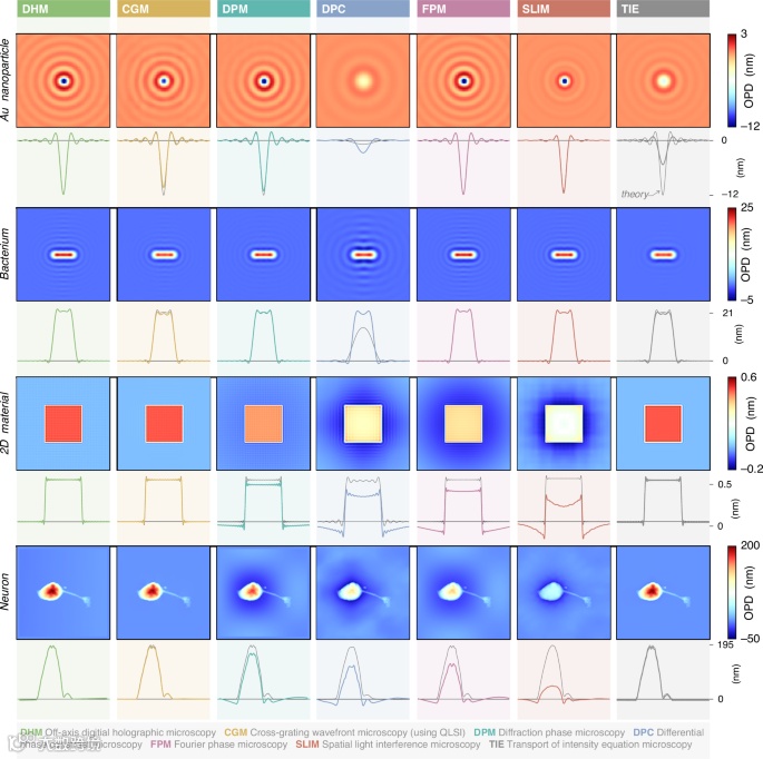 图6. 使用7种不同的波前和相位显微镜技术在同一台显微镜上对4种不同物体的OPD图像进行了28次数值模拟。每列对应一种显微镜技术,每行对应一种物体。对于每张图像,在图像中心下方显示一条水平横截面。背景中的灰色线条表示理论轮廓。