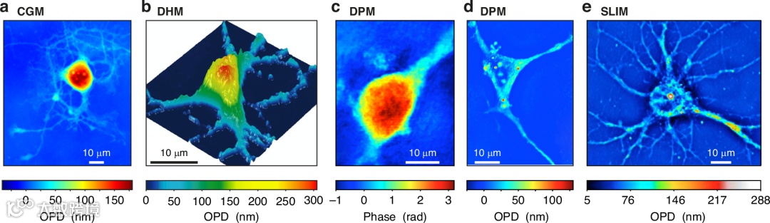 不同的QPM方法会使相似物体呈现完全不同的图像:图1展示了使用CGM、DPM和SLIM成像的神经元细胞。图1(a)和图1(b)中的图像看起来一致,具有凹凸不平的细胞图像,但图1(d)和图1(e)中的细胞看起来是中空的。当OPD图像代表干重密度时,就会发现这些图像可能无法准确反映真实物理量,因为细胞胞体含有大量生物物质,不同的QPM方法将得到不一样的结果。这引发了人们对QPM技术所能达到的准确程度的疑问。
