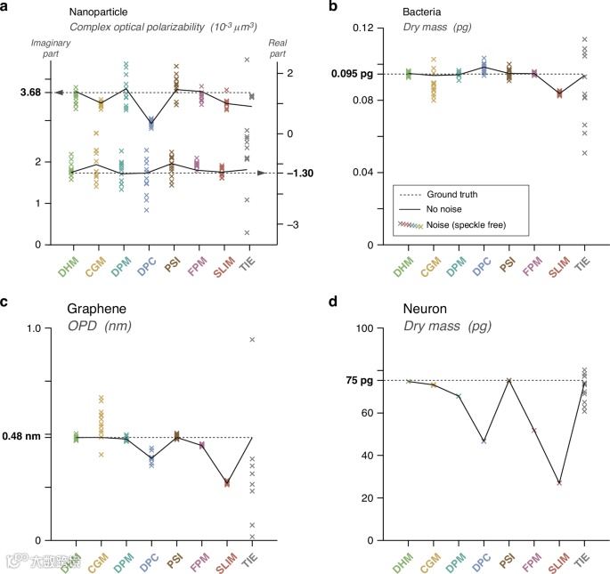 图8. 图6和图7的模拟结果中提取的生物物理量。每张图中的实线连接来自无噪声图像的值,虚线表示真实值。从12张有噪声(理想情况,无斑点)图像中获得的数据点用叉号表示。(a)100纳米金纳米粒子的复光学极化率的测量值(使用每种技术)的图表。(b)细菌的干物质值的图表。(c)二维材料的光学相干断层扫描深度的图表。(d)神经元的干物质值的图表。
