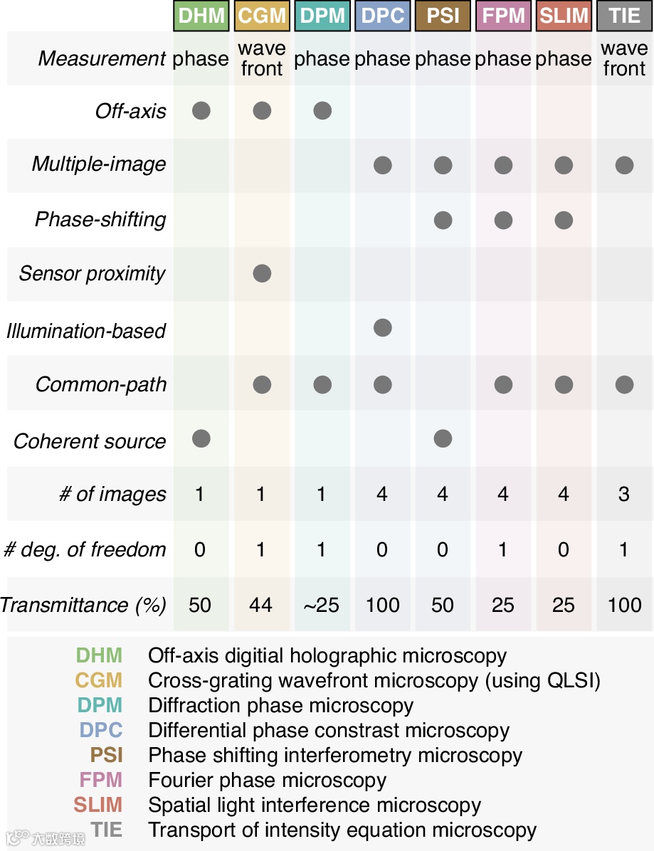 图3. 本研究中提出的QPM技术的技术特点,即QPM测量参量(波前或相位)、QPM类别(离轴,相移,相分集,或共径)、是否需要相干光源(即连续波激光照明)、形成相位/波前图像所需的典型图像数量、实验自由度的数量,以及设置的透过率。