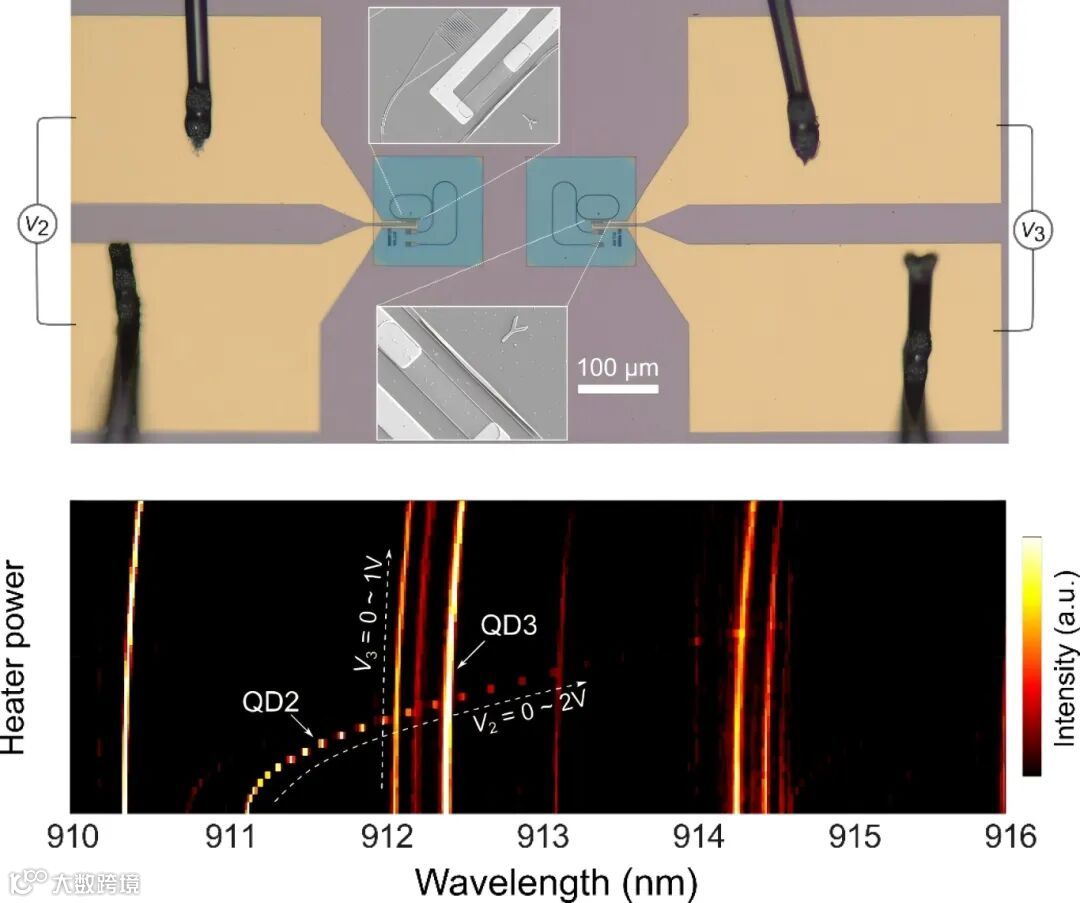 为展示该混合微腔增强确定性单光子源的片上扩展能力,研究团队在4H-SiC光子芯片上制备了两个量子点混合微腔,二者相距250 μm距离。为消除量子点由于生长导致的固有频率差异,研究团队分别对量子进行局域调谐,不仅实现了量子点与微腔模式的耦合,同时实现了不同微腔增强量子点单光子信号的频率匹配,为下一步实现片上不同节点的确定性单光子干涉,进而实现片上光量子比特互联奠定前期研究基础。