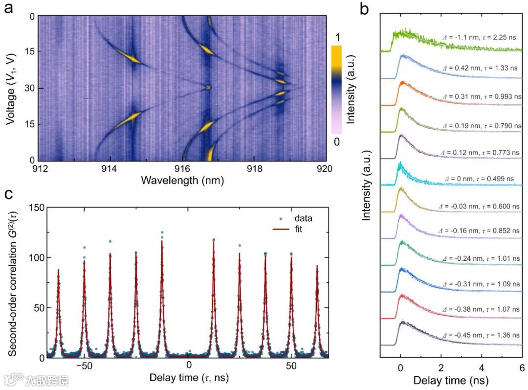图2:(a)片上调控微腔耦合量子点单光子信号;(b)量子点荧光增强;(c)片上微腔增强量子点单光子纯度测试
