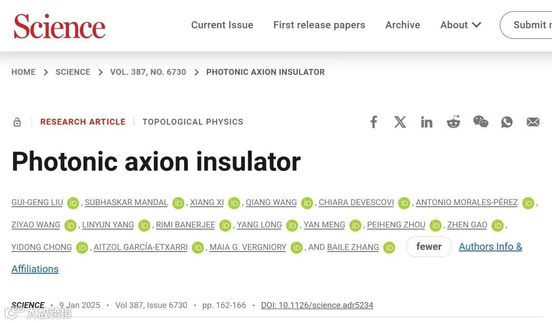 新加坡南洋理工大学张柏乐教授课题组与合作者首次实验发现了光学轴子绝缘体。研究成果以“Photonic axion insulator”为题发表于国际顶级期刊《Science》。南洋理工大学刘癸庚博士(现任西湖大学助理教授)、Subhaskar Mandal博士(现任印度理工学院孟买分校助理教授)、东莞理工学院郗翔副教授、南京大学王强副教授为共同第一作者。南洋理工大学张柏乐教授为通讯作者。此外,西班牙Donostia国际物理中心Aitzol García-Etxarri教授、Maia G. Vergniory教授、Chiara Devescovi博士、Antonio Morales-Pérez博士、南洋理工大学Chong Yidong教授、龙洋博士、Rimi Banerjee博士、南方科技大学高振副教授、硕士生王子尧、杨林运博士、电子科技大学周佩珩教授和东莞理工学院孟岩副教授等也为本工作做出了重要贡献。