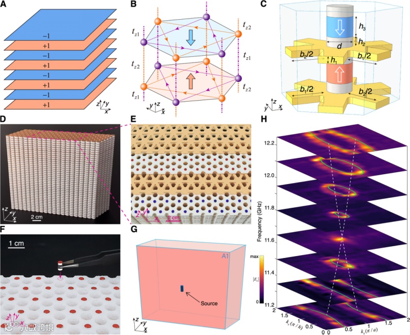本项工作通过堆叠二维陈绝缘体来构建轴子绝缘体(图3A),并且保持相邻两层陈绝缘体的陈数相反。具体来讲,研究者首先构建了一个三维反铁磁Haldane模型(图3B),它的相邻两层Haldane内部的磁通量保持相反以使得陈数相反,层与层之间通过层间耦合相连。理论计算表明,当层间耦合系数在堆叠方向(z方向)均匀分布,这个结构的zigzag侧表面支持具有单个狄拉克点的表面态,而上下表面态则具有完全带隙。基于上述理论模型,研究者设计了一种三维反铁磁光子晶体等效实现了三维反铁磁Haldane模型(图3C)。其中,每一层均为由磁性材料组成的二维光学陈绝缘体,而相邻两层的磁化方向相反。通过控制两层陈绝缘体之间耦合孔的大小,可以实现不同的层间耦合。研究者实验加工了这个三维反铁磁光子晶体(图3D-F)并在实验上观测到了具有单个狄拉克点的表面态(图3H)。