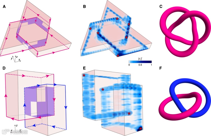 通过设计光子晶体结构,可以实现手性棱态在三维空间中的任意传输路径。例如,本工作构建了如图5所示的两种结构,其中手性棱态的传输轨迹能够在三维空间中形成一个trefoil knot或Hopf link。这种手性棱态的编织(braiding)是二维陈绝缘体的一维手性边缘态所无法实现的,因为这种编织至少需要在三维空间中进行,而陈绝缘体的边缘态被局限于二维平面。