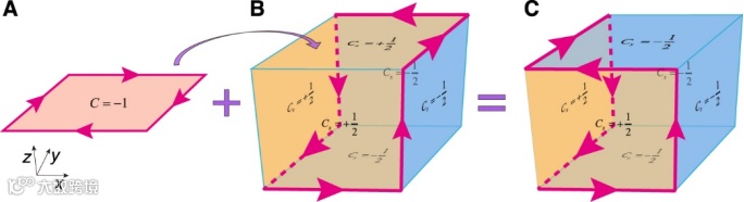 尽管轴子作为基本粒子很难被观测到,然而,三维轴子绝缘体中的轴子场可以产生诸多可观测量(图2)。首先,轴子场能够在轴子绝缘体表面产生具有半整数陈数(±1/2)的表面态。其次,在两个具有不同陈数表面态的一维交界棱上,该棱将具有一维单向手性棱态。此外,通过将一个二维陈绝缘体贴合于轴子绝缘体表面,可以改变表面态的陈数,从而调控手性棱态的传输路径。此前,轴子绝缘体的研究主要集中于凝聚态体系,但由于样品制备和表征测试等技术挑战,上述关键实验证据仍未被观测到。