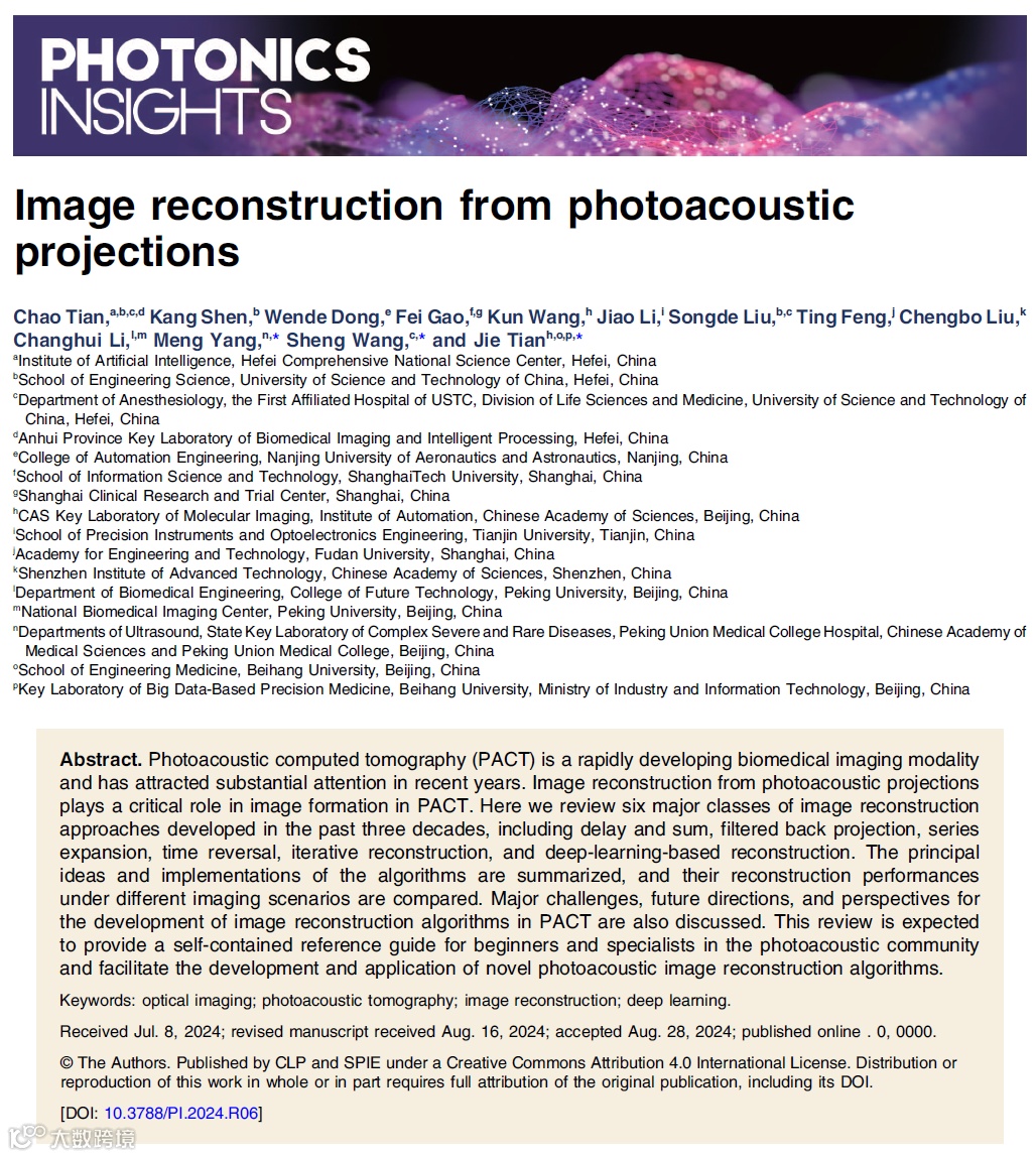 论文信息:Chao Tian, Kang Shen, Wende Dong, et al. Image reconstruction from photoacoustic projections[J]. Photonics Insights, 2024, 3(3): R06