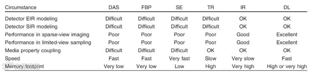 在内存占用方面,DAS和FBP算法通常只需计算感兴趣的图像重建区域,所需内存最少,其次是SE和TR算法;IR算法通常由于系统矩阵尺寸巨大,具有最大的内存占用;DL算法的内存占用情况取决于网络结构是否涉及迭代过程,其中非迭代DL算法的内存占用少于IR算法,迭代DL算法的内存占用与IR算法相当(如表1所示)。