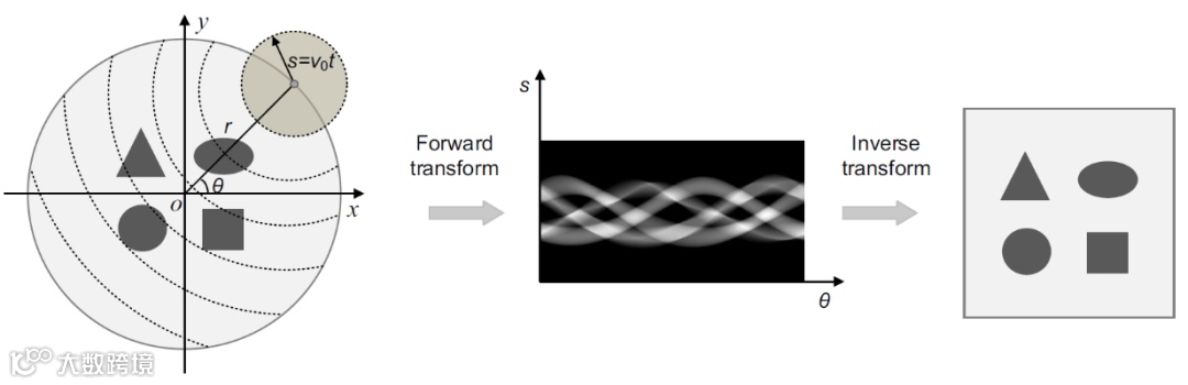 图2 PACT成像中的前向过程(圆形Radon变换)和反向过程(圆形Radon逆变换)