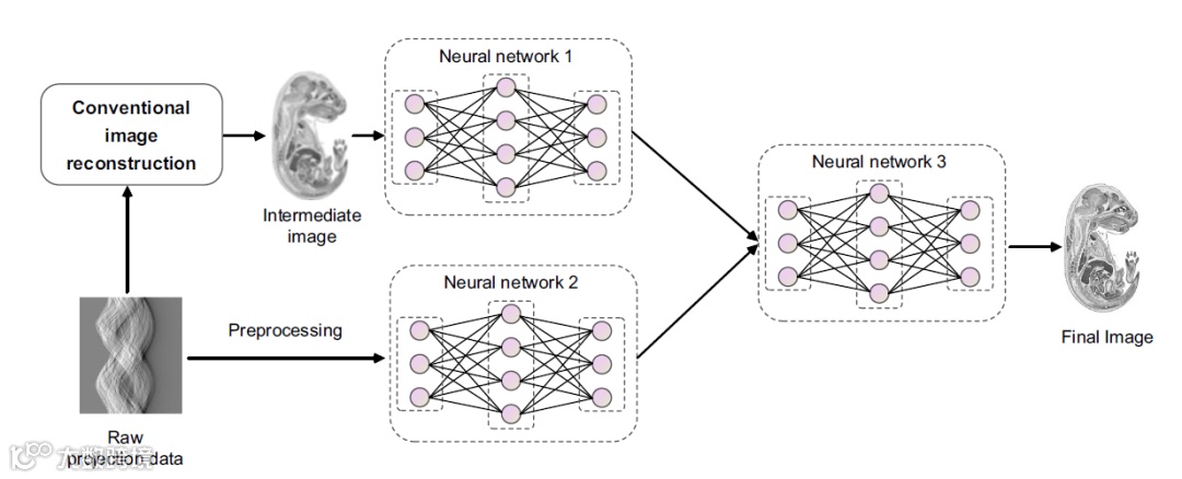 数据域信号预处理旨在通过神经网络增强原始光声投影数据,然后利用传统方法进行图像重建,解决非理想成像条件下原始光声数据不完备的问题。图像域图像后处理将深度学习作为一种图像增强工具,以传统方法重建的图像为输入,利用深度神经网络消除图像伪影,提高图像质量。