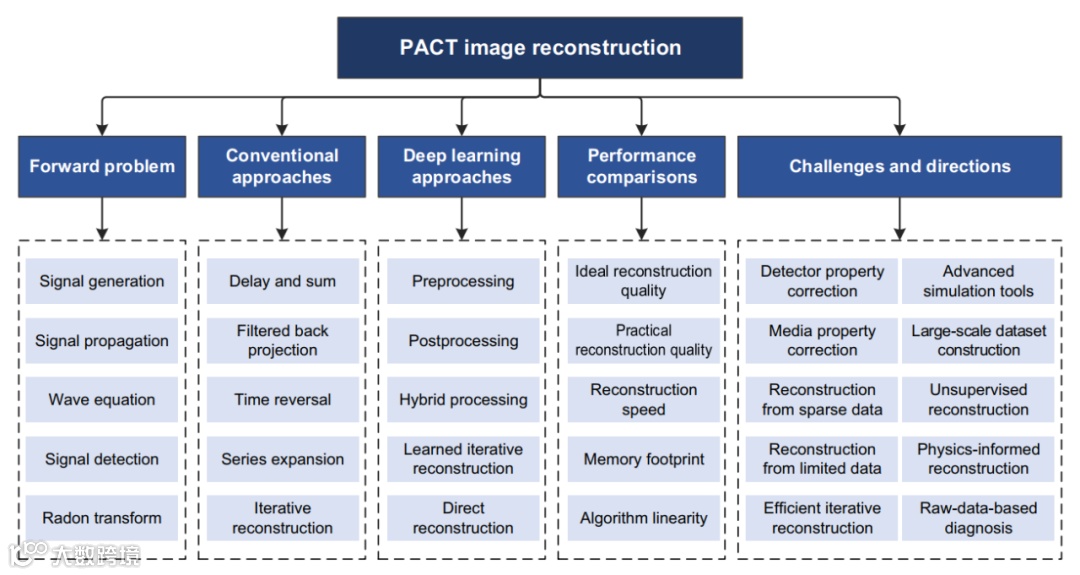该综述系统地梳理了近三十年来PACT图像重建方法所取得的重要成就,主要内容涵盖:光声断层成像前向问题、传统图像重建算法、智能图像重建算法、不同算法性能对比,以及该领域面临的重要挑战和未来发展方向等(如图1所示)。