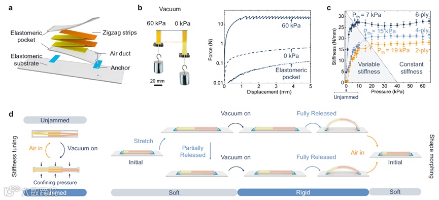 将二维 (2D) 物质受控转化为复杂的三维 (3D) 结构,为各种新兴领域带来了希望,包括软机器人、生物医学设备、超材料和虚拟现实/增强现实应用。这些方法包括使用对外部刺激作出反应的响应材料,例如液晶弹性体、介电弹性体、可膨胀水凝胶和磁响应软材料。其他技术包括折纸/剪纸结构、软气动致动器、多材料结构以及在软基板上对预图案化 2D 条带进行机械屈曲。然而,这些方法通常在制造时预设形状变形规则,因此最终的 3D 形状通常是预先确定的,无法刷新。人们一直致力于实现可重新编程的 3D 结构,例如热激活机器人表面、洛伦兹力驱动机械超表面、加载路径控制机械组装,但代价是需要不间断的能量输入或可变形的 3D 几何形状有限。此外,这些可重新编程的变形结构通常缺乏有效的承载能力,这限制了它们在触觉设备中的实际应用,因为轻轻触摸可能会使变形结构塌陷。