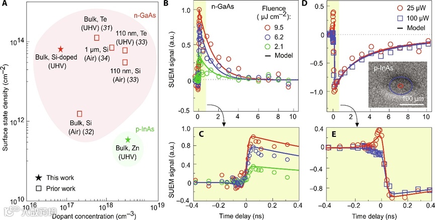 Ⅲ-Ⅴ族半导体是超快、超小型光电子器件设计的重要材料,其载流子激发、传输和复合的性质决定了器件在光伏、光电子学等应用中的可行性,例如Ⅲ-Ⅴ族多结光伏电池的性能取决于光致载流子的寿命、扩散长度以及电荷分离效率,半导体快速光电探测器依赖于高效的电荷分离以及高载流子迁移率,场效应器件的调节范围受到表面态的限制等。这些器件的性能由纳米尺度的结构决定,而器件材料的载流子动力学发生在超快(亚皮秒)尺度上。由于半导体中的载流子密度和表面陷阱态随着尺寸或者固体的界面、局域无序、表面态等发生显著的变化,时空联合表征能更好的理解半导体器件的性质,从而为光学和电子设备的设计提供理论指导。然而,获得半导体光激发载流子的时空演变是一个相当大的挑战,一般超快光学手段空间分辨率受制于光学衍射极限,而扫描电子显微镜的时间分辨率低于很多高速器件的要求。