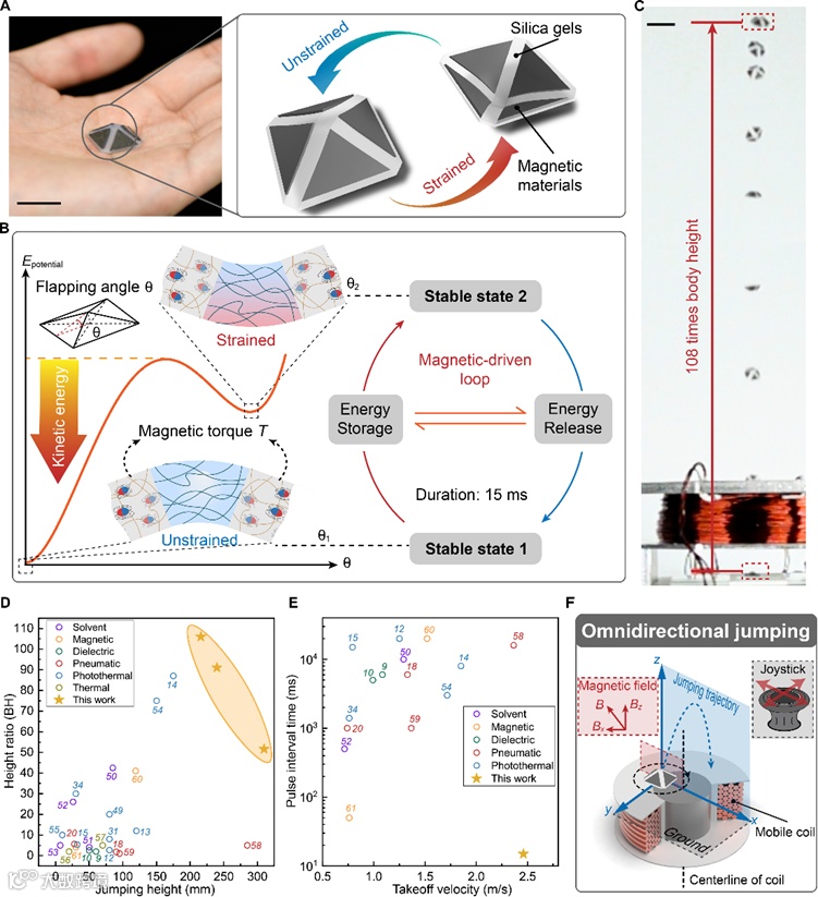 从昆虫到鱼类,许多生物都利用跳跃作为运动、捕食或躲避天敌的手段。与爬行或滚动等其他运动方式不同,跳跃已被证明具有高效率和对复杂地形的适应性,并且在小型化机器人领域的潜在应用受到了极大的关注。近年来,采用具有大弹性变形、高抗冲击性、耐用和机械坚固功能的跳跃机器人取得了进展。其中包括一系列基于各种驱动方法的软跳跃机器人,包括介电弹性体、液晶弹性体、燃烧和软流体驱动器。然而,现有的软跳跃机器人在跳跃能力上仍无法与自然生物竞争。由于软材料的低模量和柔顺性,设计出既具有优异跳跃性能又具有高柔韧性的软机器人仍然是一项挑战,特别是在小尺度下。跳跃过程中对高功率输出的要求是一个难点,大多数软机器人的驱动力来自于刺激源,因为刺激源直接驱动软材料,使其模仿自然界中肌肉的收缩和松弛。此外,机器人跳跃机构的设计以实现快速响应和短脉冲间隔时间的高效运动,也是一个挑战。