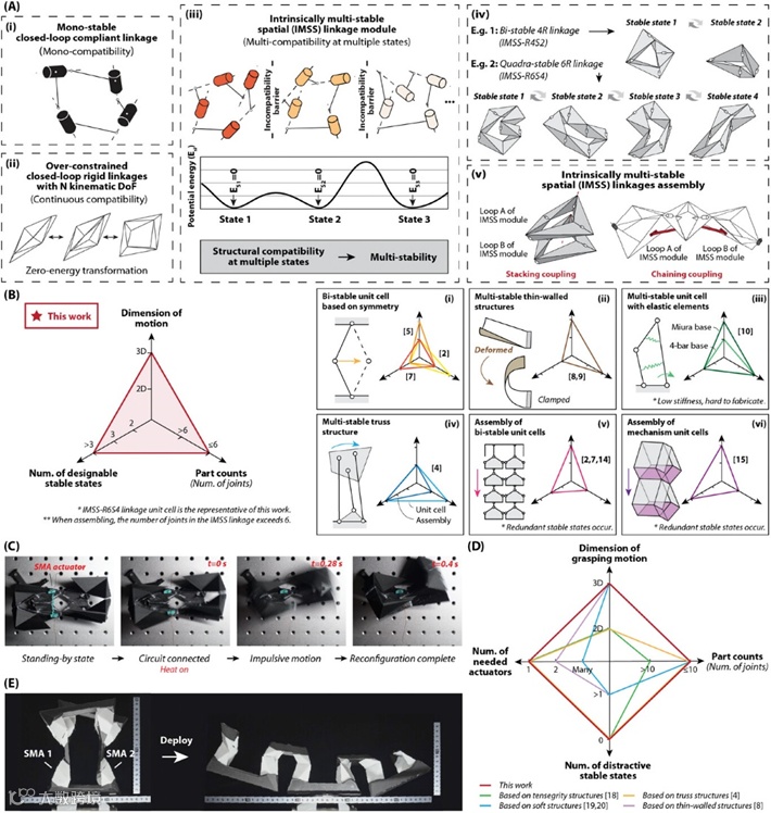 机械可重构性是机器人和超构材料的理想特性,可通过不同的几何构型实现不同的功能。多稳态变形结构可在多个预定构型下自稳定,具有以下优点:在工作状态下自锁定,不需要持续驱动;能量图中的吸引域中,允许使用较少的不精确/轻量级驱动器,如智能材料;与过度受限的机构相比,扩展了设计空间;由于结构不稳定性,形状可快速转换,可以应用于某些快速驱动的机器人中。目前大多数多稳态单元都是平面结构,而空间联动结构可以产生复杂的3D运动,具有更广阔的应用前景。