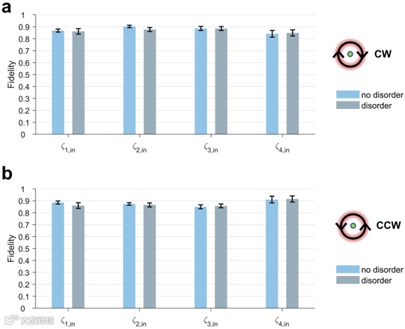 研究者在自由空间光学平台上,实现了对应图1a的量子行走。并且展示了如图2中不同量子纠缠态环绕四阶奇异点的手性调控结果。更为重要的是,通过在参数中引入无序后,可以从图3a中看出,和不加无序性相比,顺时针环绕奇异点的量子纠缠态演化结果几乎没有改变,保真度的数值也验证了这一点。同样的鲁棒性也可以在逆时针环绕奇异点的量子纠缠态演化结果中发现,见图3b。上述研究证明,围绕奇异点的量子纠缠态手性调控具有很强的鲁棒性。