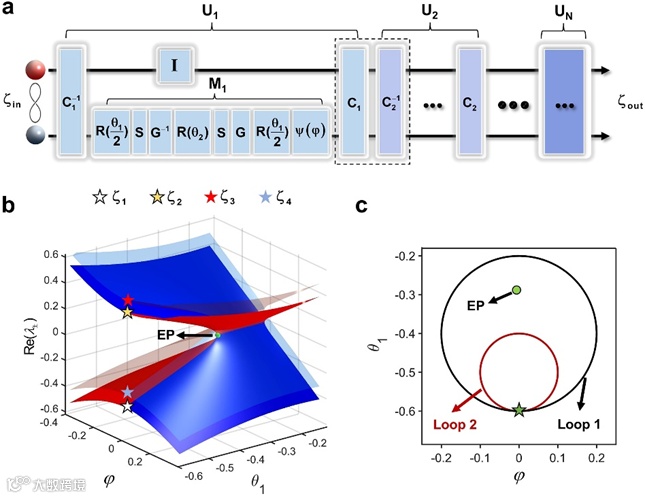 图1. 基于量子行走实现环绕奇异点的动力学演化