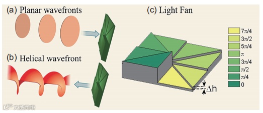 图1 生成具有螺旋波前的激光束的装置(b),通过将具有平面波前的激光束(a)反射到所谓的“光扇”(c)上来实现。