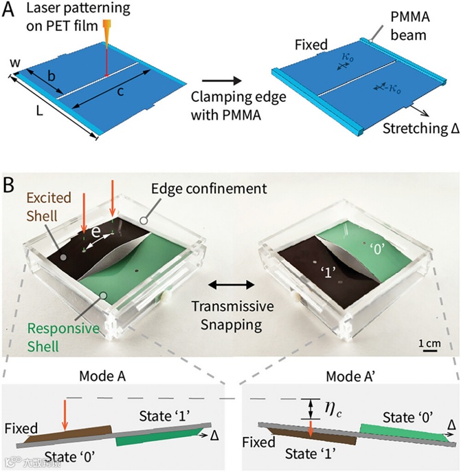 受自然中生物体形态计算的启发,结构的弹性变形来感知和处理信息开辟了一种新的计算模式。这里的形态计算被认为是连续物理体的几何形状和材料弹性变形的结合。与基于链接的机械计算不同,在机械计算中使用形状变形软材料和柔性结构已成为创建分布式、低功耗传感器和执行器的一种潜在方法。在机械系统中,信息可以通过多稳态结构的可逆形变进行写入和擦除。与编码存储器相比,二进制逻辑运算是布尔计算的基础。通过集成多个逻辑门,可以进行二进制计算。通过布尔计算进行的机械二进制逻辑和计算利用了弹性结构的双稳态性。两种稳定状态之间的切换通常是通过突弹跳变不稳定性实现的,可以由各种外部刺激触发。然而需要为这些逻辑运算设计特定的结构构型,这可能会限制其微型化和集成到更复杂的电路和计算系统中的潜力。为了克服这些障碍,有人提出了可重新编程逻辑运算和内存机械计算的方案。然而,要将这些技术集成到更复杂的电路中,并为潜在的软体机器人应用实现可扩展性,仍然存在挑战。