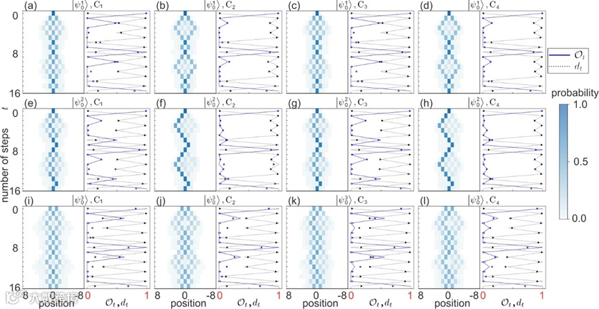 图2 不同初态(行)及不同硬币抛掷算符(列)时态复现及其产生的周期性