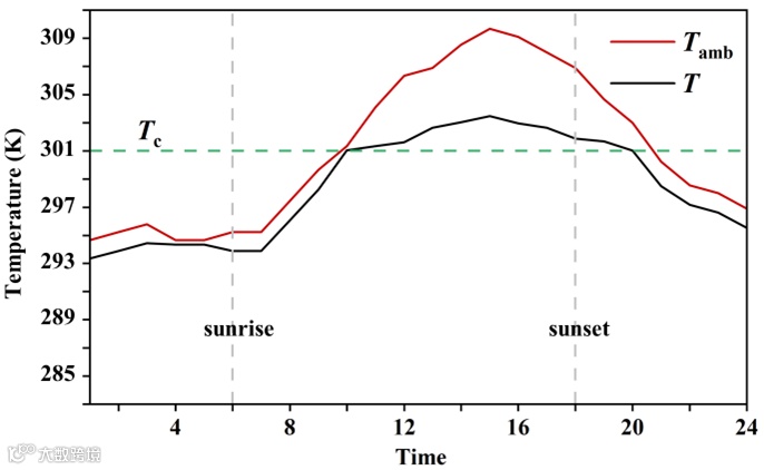 在这项研究中,我们还模拟了在洛杉矶室外环境条件下,自适应选择性发射器的温度随时间的变化。图 5 展示了自适应选择性辐射器在 24 小时内的模拟温度变化。在清晨至上午 10 点和晚上8 点之后,环境温度Tamb下降。当VO2的温度降到Tc以下时,结构起加热作用,使结构的温度接近环境温度。上午10 点以后到晚上8 点左右,Tamb上升,当VO2的温度超过Tc时,结构处于冷却状态。下午3 点的冷却效果最大,温度降低了约6.4 K。因此,该结构可有效缩小昼夜温差,从而实现全天候辐射热管理。