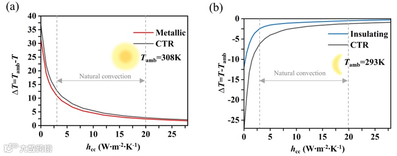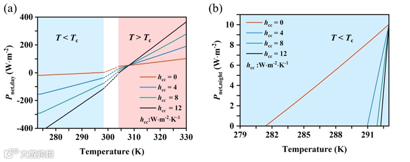 我们将Pnet= 0 时的结构温度T 与环境温度 T之间的差距定义为∆T。图4显示了温度自适应系统在白天和夜间的温度调节效果,并与无辐射加热效应的传统温度自适应辐射(CTR)冷却器进行了比较。在自然对流条件下(3 <hcc< 20),结构的白天平均温度比Tamb低5.8 K。与CTR 相比,该结构白天的平均冷却效果仅低0.9 K。这表明本文提出的结构在白天同样具有良好的冷却效果。如图 4(b)所示,该结构在夜间的平均温度仅比Tamb低1.3 K。与CTR 相比,温度自适应结构在夜间的表面温度平均高出1.9 K。不同hcc值下的温度变化表明,该结构可有效实现昼间辐射冷却和夜间辐射升温的功能,从而有效缩小昼夜温差。