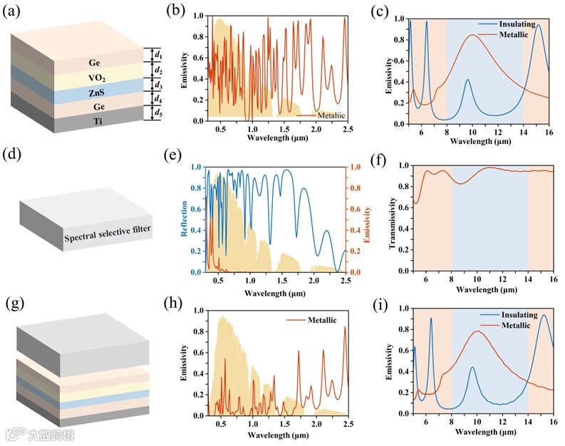 我们将底部的选择性发射器与顶部的光谱选择性滤光器结合起来,形成一个温度自适应选择性发射器,如图2(g) 所示。在昼间,上部滤光器具有较高的太阳反射率,当VO2处于金属相时,在光谱选择性滤光器的存在下,整体结构在太阳光谱范围内具有较小的吸收率。同时,它在8-14 μm 波段具有较高的选择性发射率,而在其余波长范围内的发射率最低。在夜间,该结构在大气辐射波段具有高吸收率,在大气透明波段具有低发射率。
